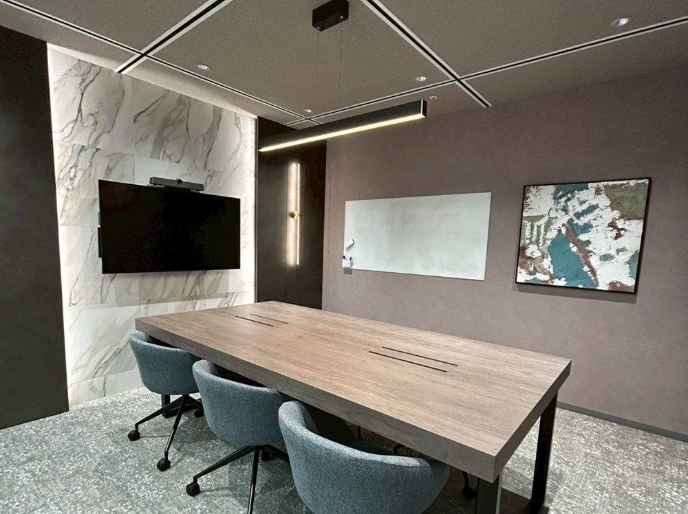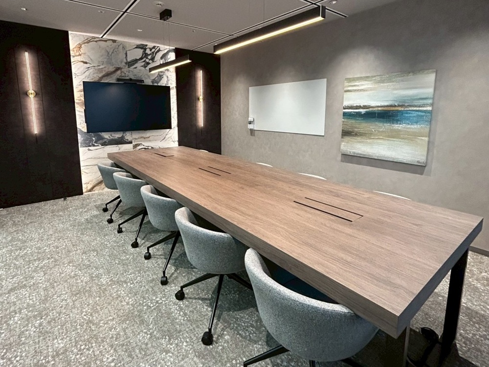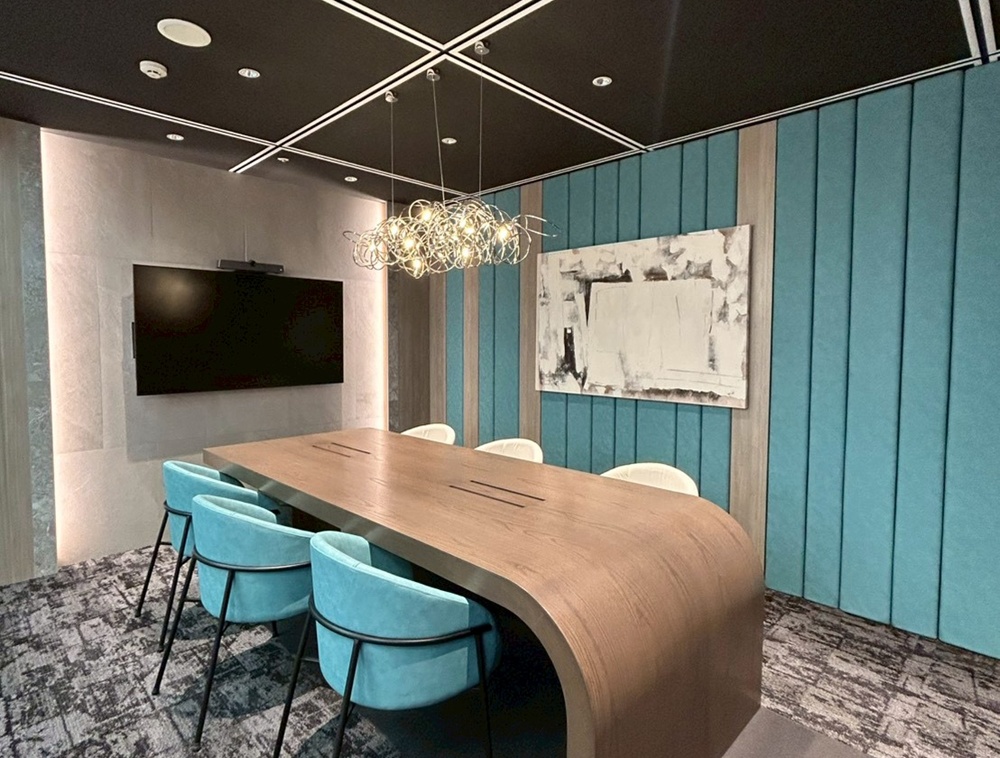 ターコイズブルーの壁面が美しい会議室には、床に向かって滑らかなアール(曲線)を描く特注の木目テーブルを配置。空間を彩るワイヤーシャンデリア等も、電気工事の専門技術で美しく安全に設置しました。
