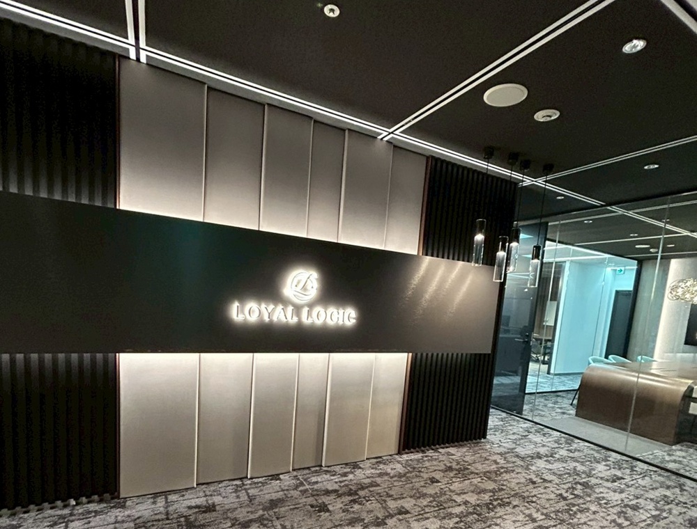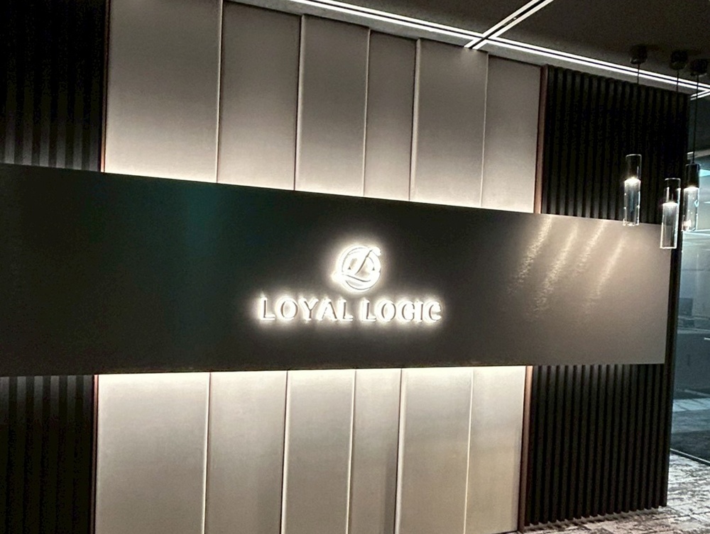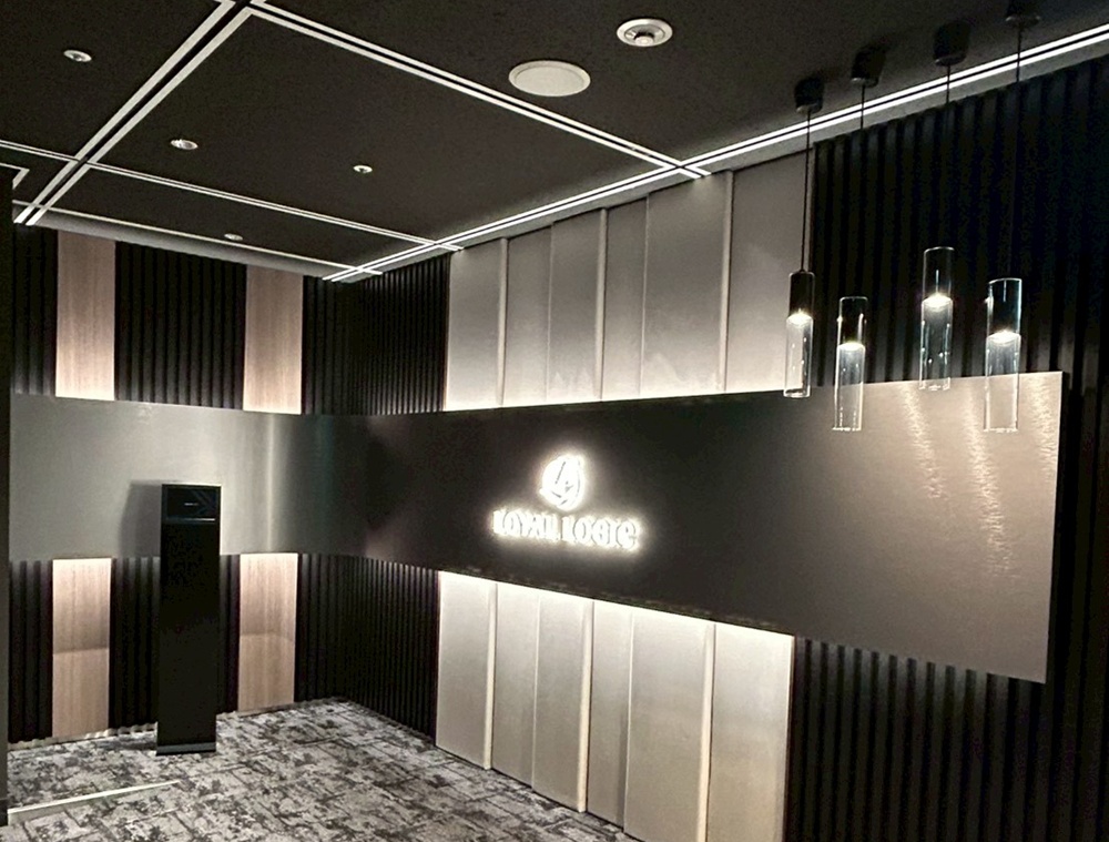 顔となるエントランスは、木目調ルーバー、ファブリックパネル、金属など異なる素材を複雑に組み合わせています。高度な「納まり」の技術と、ロゴを浮かび上がらせる緻密な配線隠ぺい・間接照明の処理により、高級感を持つデザインを実現しました。