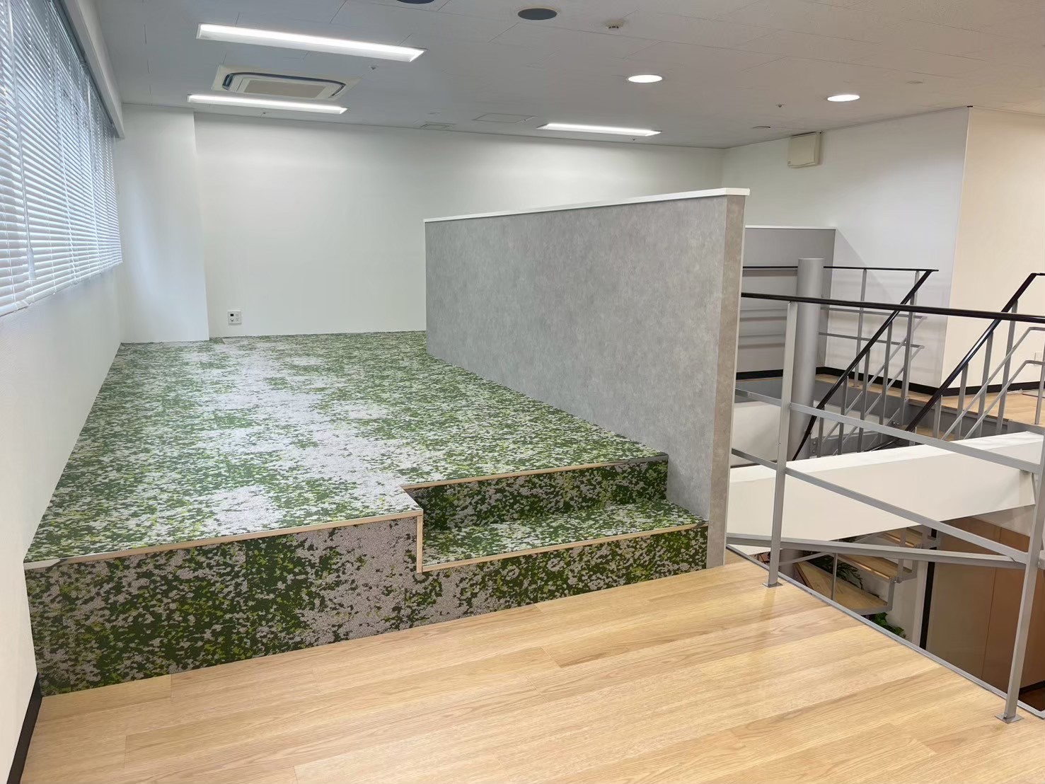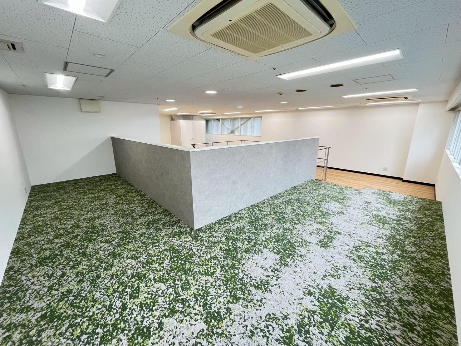 12階のエントランスから執務室にかけては、タイルカーペットとフロアタイルを貼り分けることで、壁を作らずに緩やかなゾーニングを実現しています 。グリーンのグラデーションを活かした床材は、それ自体が強力なアイキャッチとなります。