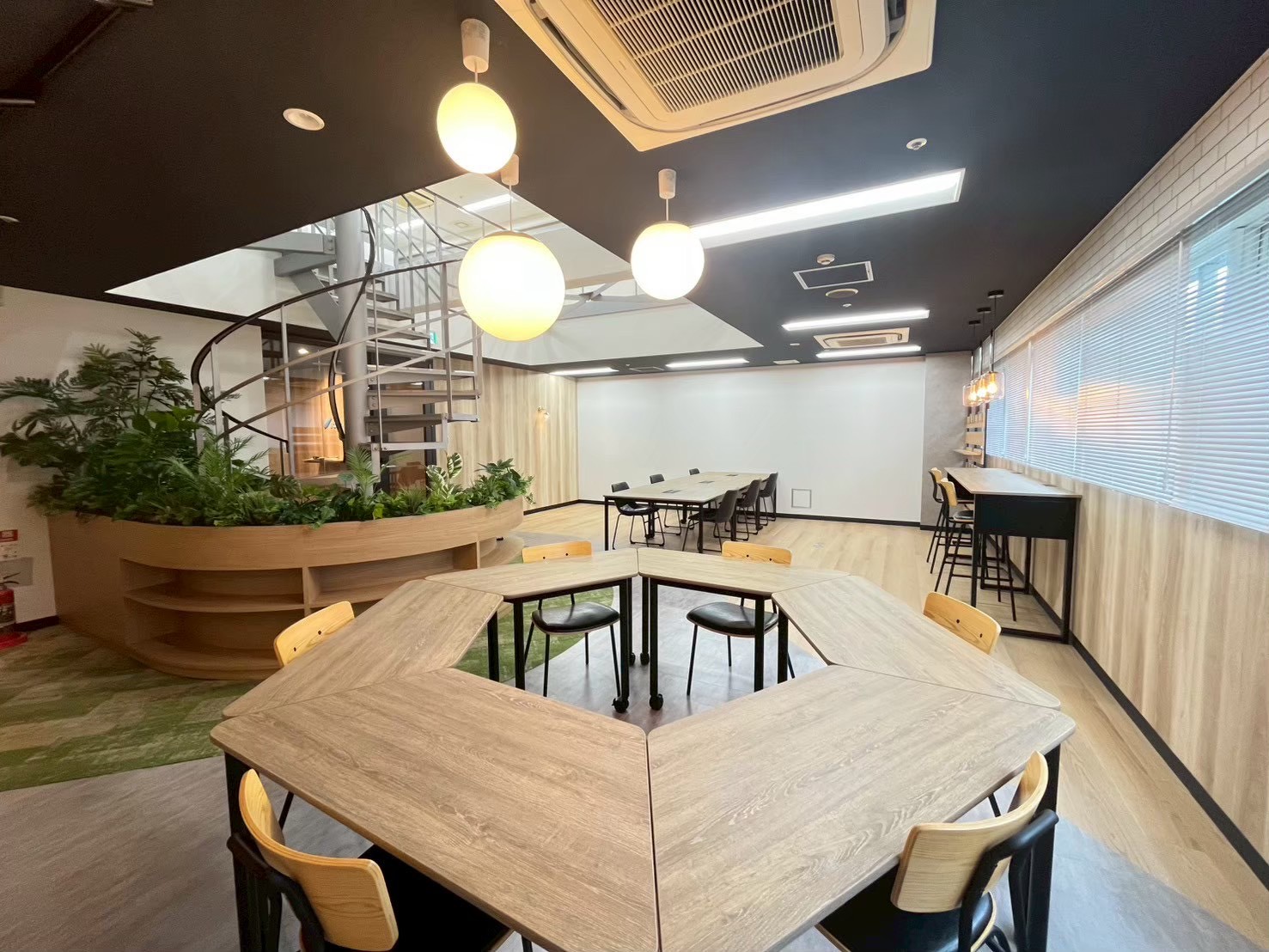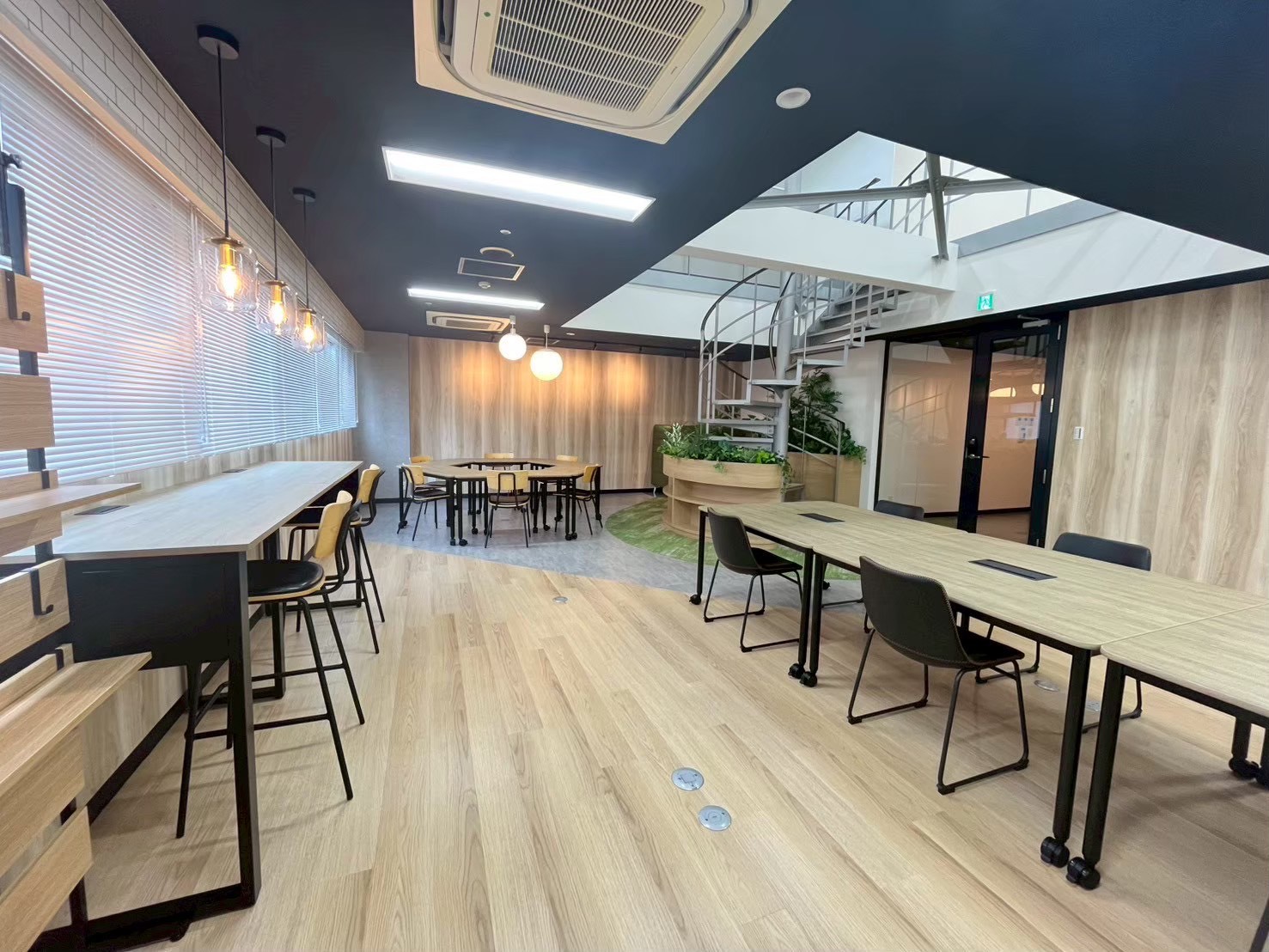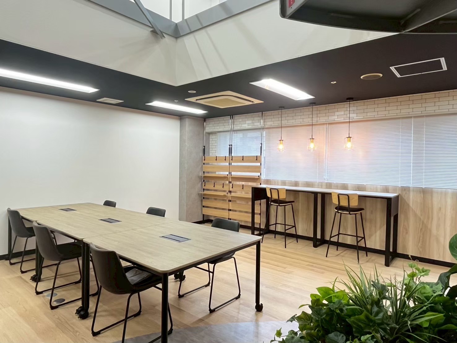 ・執務エリア: プロジェクター投影用クロスや、レンガ調のアクセントクロスを取り入れ、カジュアルな発信にも対応 。