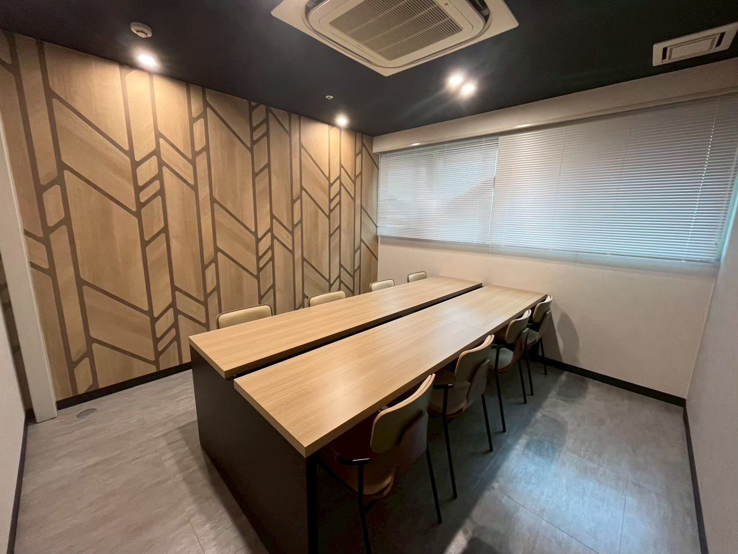 ・会議室: フォーマルな印象を与える木目と、落ち着いたトーンの無地クロスを組み合わせ、プロフェッショナルな対談シーンを演出 。